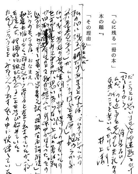 | テキスト:011 *井上 清(大2)京大教授 日本史 マルクス・エンゲルス「共産党宣言」(岩波文庫) レー二ン「国家と革命」(岩波文庫) 『私の心に残る本をただ一冊だけあげるとなれば、マルクス・エンゲルスの「共産党宣言」か、レーニン「国家と革命」のどちらかしかない。もっと当世の高校生向きに当り障りの少ないものをさがしもとめてみるが、思い当らない。上記の書は私が旧制高校二年生のとき秘かに読んで身体中がほてった。その以前に、カウツキー著、高畠素之訳「改造資本論解説」というのを、これは秘密版でなく、改造杜から堂々と売り出されていたが、これを読んで、理論的に物を考えることを学び始めていた』 |