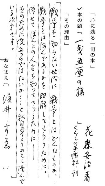 森安安治著「一銭五厘の旗」(くらしの手帖社刊※) . 『戦争を知らない世代に戦争とはどんなものか、戦争とは何んであるかを理解してもらうために−。 そのために役立つのではないか・‥・‥と私自身くりかえし読んでいる次第です』 |