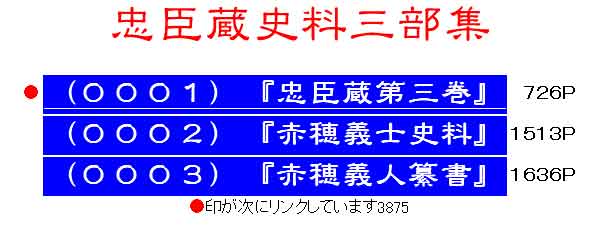 | 写真(2)は、忠臣蔵の重要史料三部作をリンクして情報処理化したものです。 (1)『忠臣蔵第三巻』をクリックします(1回目)。 |
