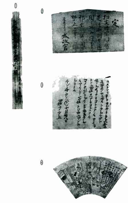 | B 文化財保護政策は第二次世界大戦後に大きく進展した。1949年に白鳳文化の絵画作品が焼損し たのをきっかけに,翌年文化財保護法が制定されたが、この年に北山文化の遺産である(ア)が焼失し ている。高度経済成長の時代には、開発にともなう埋蔵文化財の破壊が問題になる一方、1972年には(イ)壁画の発見が関心を集めた。 この文化財保護法にもとづく国宝にどのような歴史資料が指定されるかが注目される。近年では、(c) 農民自らが書いた紀伊国阿S河荘民の訴状を含む高野山文書や、永仁の徳政令などを含むことでも 知られる東寺百合文書など、広範な人々が残した文字史料が国宝に指定された。さらには、(d)近代の 文化財や世界遺産への関心も高まっており、人類全体の未来を展望するたに文化財をいかして行く視 点が求められている。 問4 空欄(ア)(イ)に入る語句の組合せとして正しいものを、次の@〜Cのうちから一つ選べ。 @ア 銀閣 イ 法隆寺金堂 Aア 銀閣 イ 高松塚古墳 Bア 金閣 イ 法隆寺金堂 Cア 金閣 イ 高松塚古墳 問5 下線部(c)の史料の写真として正しいものを、次の@〜Cのうちから一つ選べ。 | ||