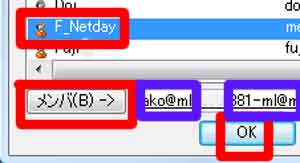 | (8)次のメンバーのメールアドレスをクリック→「メンバ(B)」をクリック→アドレスの表示→「OK」 |