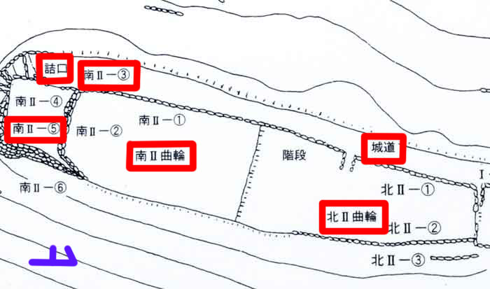 | 南U曲輪は、標高301.05mの感状山山頂より南に伸びるやせ尾根上にある。 山頂のI曲輪の北西には、5段の削平地からなる北曲輪群があり、南にはU曲輪が尾根上に伸び、急斜面を5段の郭に削平し石垣で支える南曲輪群に続く。U曲輪は北U曲輪と南U曲輪に分けられる。その境は、約30cm〜40cmの石垣で区画され南U曲輪が1段高くなっている。I曲輪と南U曲輪との比高差は約4.21mある。また、南U曲輪と南曲輪群第5郭との比高差は約23.5mである。 南U曲輪は、東西約16m、南北約35mを測り、全体は石垣によって支えられ、やせ尾根上を最大限に利用している。東側は急斜面のため石垣は崩壊しているが、斜面の所々にその痕跡を残している。西側は約2mの切岸を石垣で支え、その下に幅約3.5mの帯曲輪が北U曲輪をへて北曲輪群へと続いている。 敷地の北半部いっぱいに南北9間(京間)、東西6間半小間中とする大規模な建物である。 |