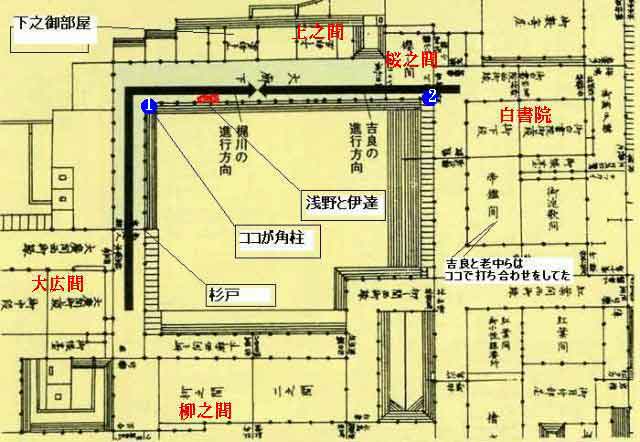 一人ハ大広間の御椽頬杉戸の内へ入申候、一人ハ我等後の方へ参り申候、さて大廊下御椽の方角柱の辺より見やり候へは、大広間の方御障子際に内匠・左京(伊予吉田藩主伊達村豊)両人被居夫より御白書院の御杉戸の間二三間を置候て高家衆大勢被居候体見へ候間、右の坊主に吉良を呼被呉候様申候ヘハ参候て即立帰り、吉良殿にハ只今御老中方より御用之儀有之て被参候由申聞候、