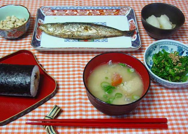 恵方まき 鰯塩焼き 春菊ゴマ和え 白菜漬物 かす汁 節分豆 | |