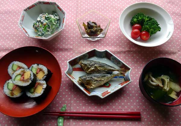 巻きずし‣ 鯵の塩焼き・ ほうれん草の白和え ・なすの辛子漬け ・