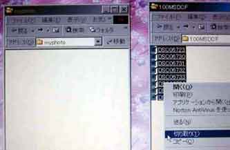「myphoto」のウインドウを画面の左にドラッグ、デジカメのウインドウを画面の右にドラッグした写真 |