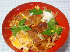 1.鰻は一口大に、玉ねぎは薄切り、エノキダケは食べやすい大きさに切る。 2.鍋にたれを入れ、(濃いければ水で薄めて調節して)火にかけて煮立ったら玉ねぎ・エノキダケ・鰻を入れて、煮立せる。 3.Aに三つ葉を入れて溶いた卵を回し入れ、蓋をして半熟になりかけたら火を止める。 4.丼にご飯を入れ、その上にBをのせる。 |