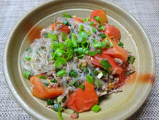 | 緑豆春雨・・・50g トマト・・・2個 合びきミンチ・・・150g ネギ・・・10本 ニンニク・・・1片 ナンプラー・・・大さじ2 砂糖・・・小さじ1 |