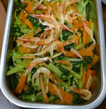 1.ミズナは熱湯で茹でて冷水にとり、堅く絞って4cmに切る。 2.人参はマッチ状に切る。 3.ボールに調味料とゴマを入れて和え、桜えびをのせる。 |