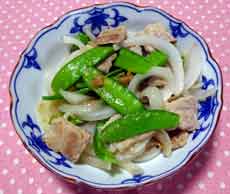 1.玉ねぎは5mmのくし形に切る。エンドウは筋を取る。豚肉は食べやすい大きさに切る。