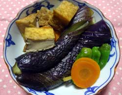 3.鍋にだし汁を1カップと調味料を入れて、なすや厚揚げやその他の野菜を入れて煮る。
