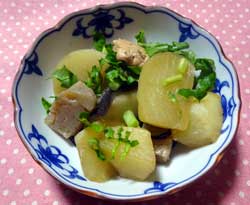 1.大根は乱切りに、鶏肉は食べやすい大きさに切る。 2.こんにゃくは両面に切り目を入れて、長方形に切る。 3.鍋に油を熱して、肉を炒め、こんにゃく、大根を入れて更に炒める。 4.Bにだし汁を加え、沸騰したらアクをとり、調味料を入れて30分程煮る。 5.最後に、大根葉を小さく切って散らす。 |