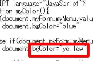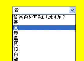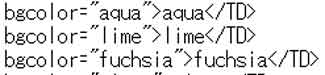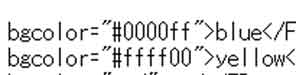 | 1 | この「下のチェックをクリックして、好みの色を選択してください」では、16色を英語で表記してします。 blue、yellow、red、black、gray、silver、white、navy(紺)、teal(鴨)、green、aqua(藍)、lime(橙)、 fuchsia(唐紅)、olive、purple、maroonです。 | ||||||||||||||||||