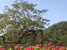ツツジの向こうに大ムクノキ