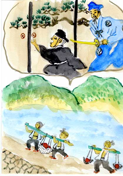そこへ、常陸の笠間から浅野の殿様が赤穂にやって来ました。