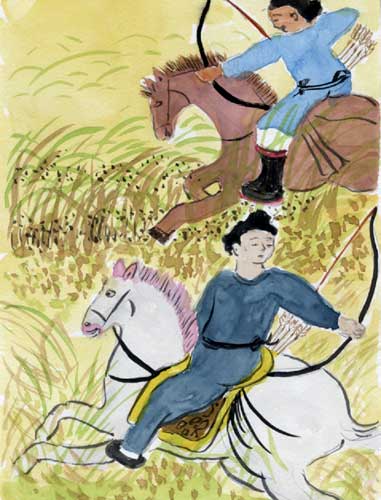 芝六は、超人的な蘇我入鹿を殺すには、爪黒の鹿の血と嫉妬深い女の血が必要と教えられ、爪黒の鹿を射殺します。