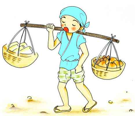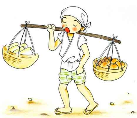 | 二日目に、やっぱり売れなんだいうて戻ってきた。 「どがいないいようしたんぞ」 というと、持っている物を、一ぺんにいわにゃわかるまいと思うて、 「チャックリカーキフッ・チャックリカーキフッ」 というてまわったという。 「そがいないいようでは、なおわからん、茶は茶で別々、栗は栗で別々にいわないけん」 と教えられた。 |