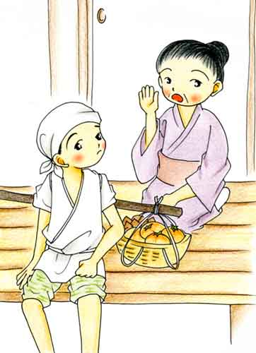 | 三日目には朝早くから、大きな声で、 茶ぁは茶ぁで ベーつべつ くーりはくーりで ベーつべつ かーきはかーきで ベーつべつ ふーは ふーで ベーつべつ といいながらまわった。 |
