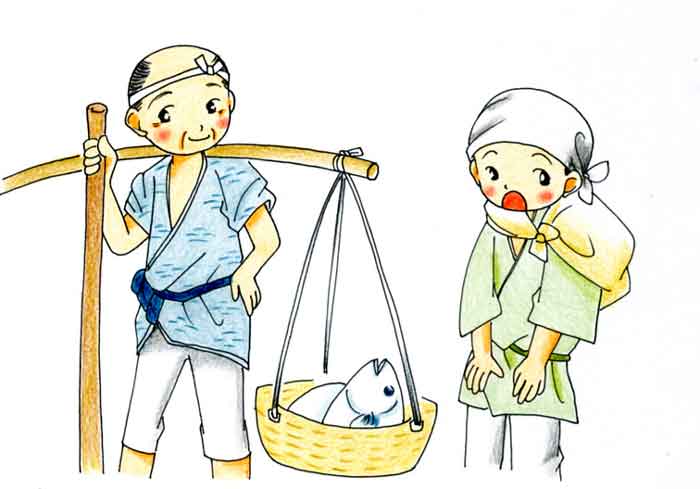 それからつぎに、魚売りが大きな魚の頭を、かんご(籠)に入れて、担(にの)うて行きよる。