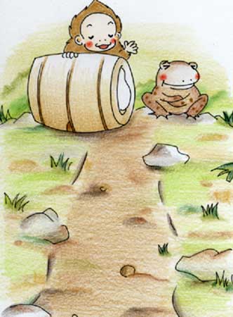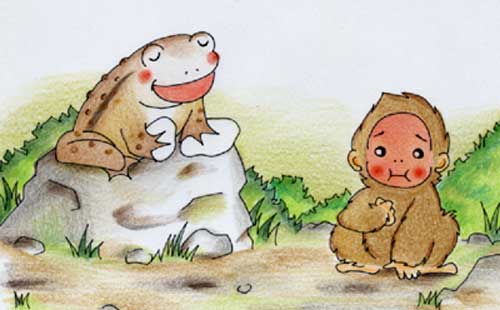 | 昔、猿の顔は白かった。 そのころ、山の下の家で餅(もち)つきをしていた。 一匹のおんびき(ひきがえる)が、餅が食いたいなと思うて、門口(かどぐち)からのぞいていた。そこへ猿がきた。猿も餅が食いたいなと思うた。それからふたりで相談して、おんびきが、裏へまわってゆつ(井戸)の中へはいって、子の鳴声(なきごえ)をする。家の人たちがびっくりして、見に出た間に、猿が門からはいって、餅を取って、山の上へもって上る。それからあとで、二人でわけて食(く)おうということにした。 おんびきは、そっと裏へまわって ゆつの中へパシャンととびこんで、ギュー、ギューと鳴いた。 「それ、子がゆついはまったがな」 というて、家の人たちは、あわてて裏へ出てしもうた。 |