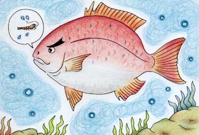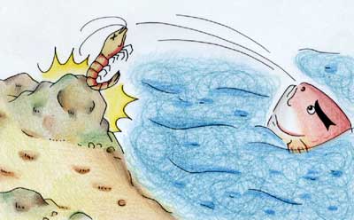 えびはびっくりして目をあけて見たら、岩の中の洞穴と思うたのは、大きな鯛(たい)の鼻の穴だった。