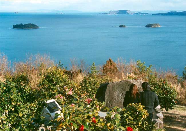 | 瀬戸内海から北を見て、相生湾の左手が釜崎といい、右手が金ケ崎といいます。金ケ崎は万葉の岬とも言われます。 万葉の岬から逆に南を見ると、視界がいい時は、左手に淡路島・家島群島・明石海峡、右手には岡山県の牛窓が遠望できます。近景では、正面に君島、右手(西側)に鬘島ら小さい3島が眼前に見えます。この3島を辛荷の島と言われています。 辛荷の島に過る時に、万葉の歌人である山部赤人は「縄の浦ゆ 背向(そがひ)に見ゆる 奥(おき)つ島 漕ぎ廻(み)る舟は 釣しすらしも」(相生湾に通過して、振り返えると沖の島が見えた、あの島のあたりを漕ぎ廻っている舟は、まだ魚を釣っているらしい)と詠んだといいます。 縄の浦とは相生湾のこと、奥つ島(沖つ島)は鬘島のことだとされています。 |