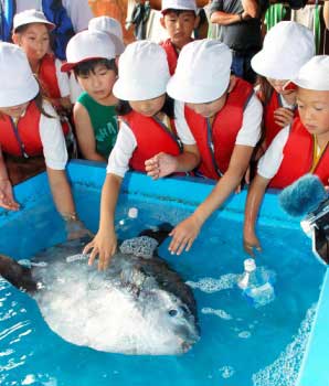 | マ初めてマンボウに触って興奮する児童ら=相生湾の壺根港 |