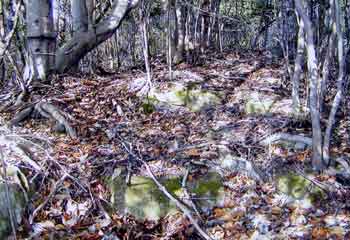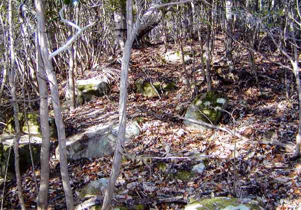 墳丘が流失し、石室が露出している。石室部が落ちこんで窪んでいるが、側石はしっかりしている。天井石3、側石4が崩れ落ちている。