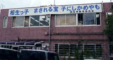 | 教育委員会の建物に掲げられている横断幕は、藤岡さん考案で山上憶良の歌を引用したものである | |||