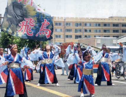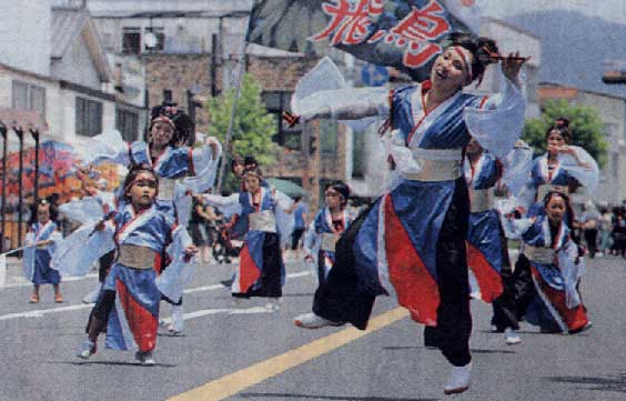 | 海上での熱戦に合わせ、町中の会場ではよさこい踊りなどのカーニバルやライブ演奏など、 さまざまな催しが祭りを盛り上げた=相生市の中央通(撮影・高田裕司) |