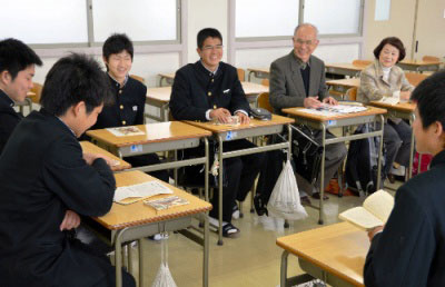 | 地域の人と読後感想を話し合う高校生=県立相生高校 |