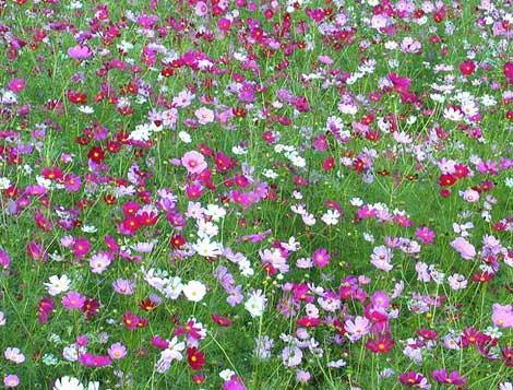 | メキシコ原産の一年草です。日本へ入ったのは幕末で、広まったのは明治12年(1879)、東京美術学校教師のラグーザが、イタリアから種子を持参して以降だといわれています。「秋に咲く桜のような花」という意味で「秋桜」と名付けられたのも明治時代のようです(週刊朝日百科「世界の植物6」より)。 当地(相生市)は市花がコスモスということもあり、市が96年から、矢野地区の農家約40軒の協力で、約10ヘクタールの転作田にコスモスを植えています。ピンク、赤、赤紫のほか、今年からは黄色の花もあるそうです(朝日新聞 2001/09/30)。写真は2001年10月2日に、矢野町菅谷の八幡神社付近で撮ったものです。 |