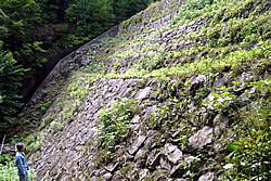 | 源重郎池(相生市矢野町小河) 大道哲男さん推薦 源重郎(げんじゅうろう)池は、相生市矢野町小河の集落から北へ約四キロ、上郡町との境に近い標高約三七〇メートルの山間部にあるため池です。 約二百年前、地元の二代目光庵源重郎が築造に取り掛かり、二代にわたって工事が続けられました。石垣は幅約四十三メートル、高さ約十六メートル=写真、貯水量は三万六千立方メートル。重機のなかった時代の苦労がしのばれます。 池は明治時代、村に寄贈されました。水の管理は徹底され、今も年二回、住民が総出で、池までの山道の清掃や補修をしています。 地元自治会の大道哲男さん(63)の推薦です。大道さんは「源重郎池は今も村の心のよりどころです」と話されています。 |