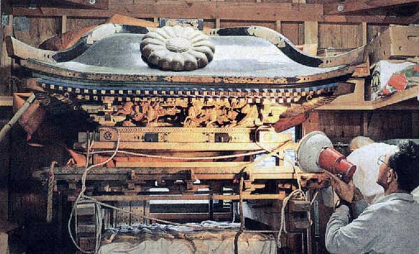 | 相生市若狭野町、相生若狭野天満神社の氏子、上松地区に保存されている屋台が、江戸・天保年間(1830〜1844年)ごろの建造とみられることが、研究者の調査で分かった。浅い屋根は屋台の原型とされる神輿のようで装飾も簡素。研究者は「これほど古い播州屋台は見たことがない」と話している。 屋台は戦前、赤穂市の塩屋地区から譲り受けたらしい。5年ごとに秋季例祭で練られていたが、担ぎ手が減り、1985年を最後に出されなくなったという。 「播州屋台学」を創始した粕谷宗関さん(65)=姫路市飾磨区=が、同地区に使われていない屋台があると聞き、このほど調査に訪れた。 その結果、紋が、菊紋と神紋(左三つどもえ)の組み合わせ▽屋根下の水切部分が青い▽屋根が浅く、錺金具の数が少ない‐など、江戸期の特徴を各所に確認。また、現代では取り外せる屋根上の露盤が固定されており、擬宝珠には大変珍しい火炎の装飾があった。 屋根下4面の彫刻「狭間」は、豊臣秀吉と柴田勝家の合戦を描いた「賤ケ岳の七本槍」。江戸時代、豊臣の勝ち戦を扱うのは禁じられていたという。加藤清正ら豊臣方武将を奥に配置するなど、配慮して彫られた様子がうかがえるという。 粕谷さんは、天保年間の祭礼絵馬や屋台の図面と比較し、同年代と判断した。「華美な装飾が許されなかった時代の姿をとどめており、わたしが約40年調査してきた中でおそらく最古の播州屋台だろう。地区だけでなく、播州全体の宝と言える」。 上松自治会副会長の川田文規さん(62)は「小さいころから身近にあった屋台の歴史が、江戸時代までさかのぼるとは。これからも大切にしていきたい」と驚いていた。 一般公開はしていない。 (長谷部崇) |