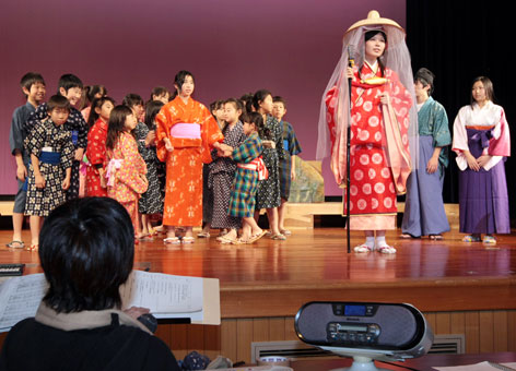 | 衣装を着けて行われた音楽劇「この子がおればこそ」の通し稽古=相生市民会館 |