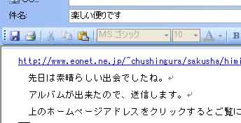 | 以上は、メールにホームページアドレス(http://www.…=テキスト文字)を貼付する方法です。 パーパーレス年賀状ということで、メールにワードやビルダーで作った年賀状を添付ファイルとして送ってくる人がいます。 この場合の問題点は、メールに年賀状を添付することで、ウィルスの危険性が高いということです。 メールに写真だろうが、文章だろうが、貼付ファイルは避けるべきです。その理由は以下の通りです。 | ||||
