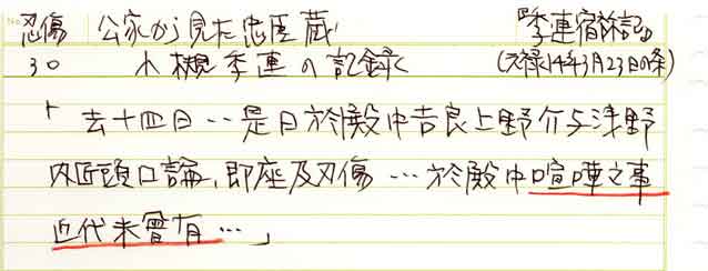 | (3)まずカードの右側の項目別から「忠臣蔵刃傷事件」の「刃傷」のパンチ穴に千枚通しでカードを選抜します。 (4)「刃傷」のカードから「公家から見た」カードを選抜します。その時は、カードの上側の「ク」のパンチ穴に千枚通しを入れます。 (5)こういう作業を通して、刃傷事件を公家から見た史料が残ります。結局、4枚のカードが残りました。 |