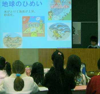 | 写真(E)は、約1100人の前でホームページを発表する6年生です。 (1)たくさんの人の前で、情報を発信していきます。 (2)とても活き活きとしていました。文科省が考えた小学生のあり方といえます。 (3)資源の少ない日本にとっては、技術が重要な資源です。 |