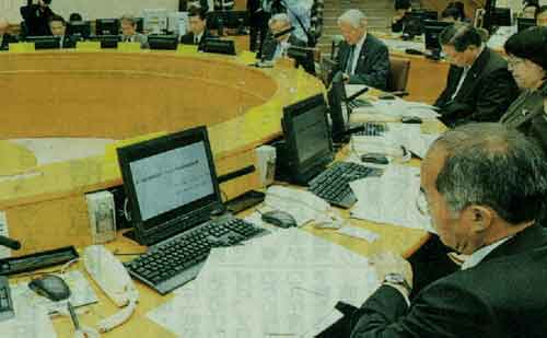 | 写真(F)は、新型インフルエンザ対策本部(兵庫県災害対策センター)の様子です。 (1)これからの子供たちが向き合う情報時代のパソコン相手の写真です。 (2)文科省が技術立国として、小学生のあり方を提示している見本といえるでしょう。 |