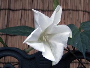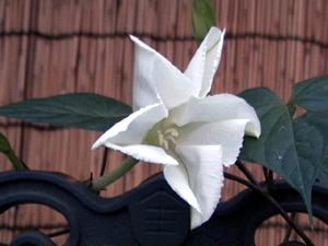 | 庭で水撒きをしていた妻が「すごいすごい、早く早く」というので飛んでいくと、白い夕顔が体全体をふるわせて花を開かせて いた。直にビデオカメラを用意したが、そのときはすでに肉眼でとらえるようなダイナミック(動的)な変化はなかった。 次に日から約1週間つぼみから満開までビデオで定点撮影を試みた。あるときは17時から19時まで粘ったが、あきらめた22 日に咲いてみたり、あるときは硬いつぼみなので、ぼちぼちビデオの準備をしていると、あっという間に咲いてしまったりという状 態であった。 以前は満開の純白の夕顔を何気なく見ていたが、夕顔の花自身の状況、その日の気象条件などによって、それぞれ違う顔を もっているんだなと感じた。 激しく夕顔の花が揺れる。ビデオをよく見ると、周囲の葉は揺れていないことに気がついた。体全身をふるわせて、花を開いてい るのである。一日花は全てのエネルギーをこの瞬間にかけているのだなーと感じて、その感動をビデオ化するまでとり続けた。 |
