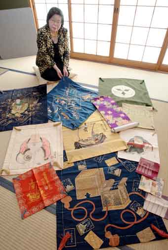 | 大上尚子さんと大徳寺黄梅院に展示する袱紗などコレクション | ||||