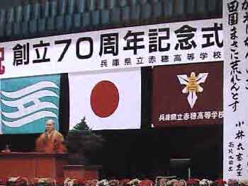 | 1997(平成9)年、赤穂高等学校は、創立70周年を迎えました。記念式典に大徳寺塔頭の黄梅院の小林太玄氏を迎えました。 以前、小林太玄氏は、講演の途中、機嫌を悪くして、帰ってしまったことがあるということで、いろいろな著名人と接触のある私(このページの作者)に、応対を一任されました。無事、講演が終り、「お帰りになりますか、それとも式典をご覧になりますか」とお聞きすると、「後輩の活躍を見たいですよ」を気さくに言われ、体育館の指定の席にご案内致しました。 この講演サボの話は、式典の記録係で暇(?)な私に仕事を与えるという計らいのため、創作されたのでしょう。小林太玄氏の名誉のため、一言触れておきます。 赤穂民報の記事のなかで、小林太玄氏の名を発見して、懐かしくも、最高に緊張した体験を思い出しました。 | ||||