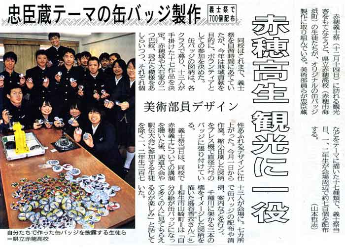| 神戸新聞|忠臣蔵のバッジ製作 赤穂高 義士祭向け700個 自分たちで作った缶バッジを披露する生徒ら=県立赤穂高校 赤穂義士祭(十二月十四日)に訪れる観光客をもてなそうと、県立赤穂高校(赤穂市海浜町)の生徒たちが、オリジナルの缶バッジ製作に取り組んでいる。美術部員らが忠臣蔵などをテーマに描いた十七種類で、義士祭当日、一、二年生が会場周辺で約七百個を配布する。(山本哲志) 同校はこれまで、義士祭を自習時間にあてていたが、今年は地域貢献を目的に、ボランティアとしての参加を決めた。 缶バッジの図柄は、各クラスで募り、十三人が手掛けた十七作品を決定。赤穂城や大石家の二つ巴(ともえ)紋、段だら模様をあしらいつつ、それぞれ個性あふれるデザインに仕上がった。今月一日から作業。縮小印刷した図柄をプレス機で直径六センチのバッジに張り付けている。 義士祭当日は、同校で赤穂義士についての講演を聴いた後、武道大会や駅伝大会に参加する生徒を除く一、二年生三百七十三人が会場に。七カ所で缶バッジの配布や清掃、案内などを行う。 千種川に架かる三本の橋をイメージした図柄を描いた島谷香(か)衣(え)さん(17)=相生市山崎町=は「自分の絵が缶バッジになって多くの人に見てもらえるのが楽しみ」と話していた。 (11/26 10:51) |
