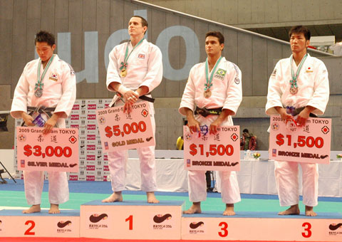 | グランドスラム東京、男子81キロ級で銅メダルの松本雄史選手=右端 |