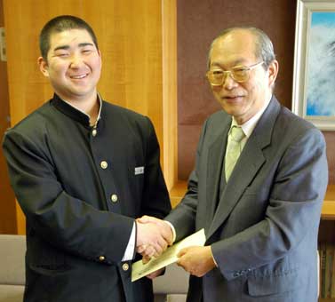 三輪選手は3月に行われた全日本選抜高校選手権の82・5キロ級で準優勝。アジア選手権サブジュニア部門の参加標準記録をクリアした。 三輪選手にとって海外遠征は初めて。豆田市長から「不安もあると思うが、存分に実力を発揮すれば結果は付いてくる。頑張って」と励まされ、「出場するからには表彰台に立ちたい」と意欲を見せた。 |