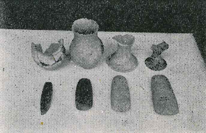 | 国道二号線に沿って東西にのびる平地のほぼ中央に南北に連らなる凸形の丘陵状の山があり、この山のゆるい傾斜地の南に面した辺り、戦後の砂防工事・植林等の工事によって相当広く掘りおこされた時、相当量の土器が石器と共に発掘されたようである。 この辺りは、南に面し古代住居の条件を備えた絶好の場所である。 この遺跡は弥生式のつぼをはじめ、高杯等の土器類と共に、磨製の蛤匁石斧・石鏃等と共にこれらをつくったサヌカイト原石が見られることから石器製造の工業地帯? ということも考えられる。 |