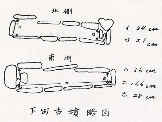 | 相生市矢野町下田字西山(通称ぼんさん山)頂上付近にある古墳文化時代中期のこの古墳は、円墳で昭和26年3月、田渕義雄氏が発見され、同年5月名古屋大学教授楢崎彰一先生と、県教育課島田清先生などが調査にあたられた。 この古墳は、同一円墳内に平行し、板石を箱形に組み合わせ、四壁を蓋で構成したものでその長さは、1.66メートル、幅36センチから28センチ(南側)のものと、南側のものとほぼ長さが同じ位で、幅が34センチから21センチ(北側)の2基の組合式石棺が安置されたものであった。 この石棺と共に、頭骸骨と青銅鏡片(一)、実戦用に供されたと思われる鉄鏃(一)、板の平面を整え、細部をつくる木工具の一種である鑓鉋(やりがんな(一)が発見された。 この円墳と同じ構造をもった古墳が、相生市内の壷根部落南方山地(相生市大谷5313番地)でも発見され、副葬品とみられる玉類が数個出土した。 |