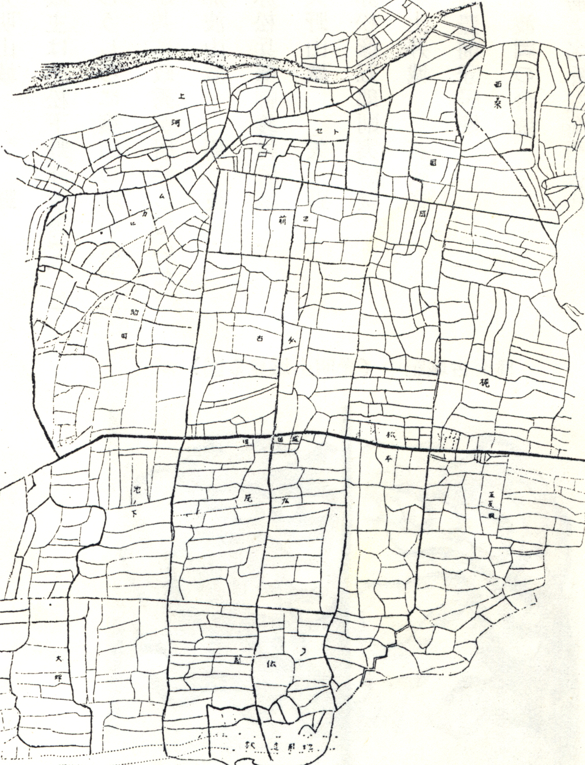 | 645年「大化の改新」以後、土地人民の私有地を禁じて公地公民とし、国民ことごとくに口分田を与え、租庸調の賦課を負わせた。 いわゆる「班田収授の制」は、わが古代国家が初めて法制的基礎の上に立つようになった画期的な改革であった。 奈良時代になり、この制度は一そう整備された。1町四方を「坪」と名付け、36の坪(6町四方)を「里」と呼び、1里のへだたりを「条」と呼ぶ条里制は、その実施のありさまを具体的に示したもので、小字の呼名に一の坪・二の坪などが今でも残っている。 中部の平地と北部の山間の平地には、大化時代から開拓が進んでいたらしく条里制の遺制がみられる。 正安元年の矢野庄例名中分実検読合帳と中分分帳とには、「一条一坪常勝谷、一反三守友」とあり、大半の筆に条と坪と小字とが記されており、条は一条から十七条に及んでいる。 一条は釜出、才元、森の各部落を含む東西3キロに及ぶ谷間の平地で、第二条とは明らかに川を以って境としていることがわかる。二条とは瓜生部落で、これより南下して3条、4条が二木・下田のあたりにあたる。ついで若狭野町にはいって寺田・八洞の一部が5条で、ここより川を渡って下土井・福井の一部が六条、福井の一部と若狭野部落が七条にあたっている。更に十三条は南に山を負うている雨内・入野の両部落を含む大区域であって、北方は水田川を境として八・九・十条と接していることが明らかとなった。 更に実地に調査して国道以北の地においては、八洞の一部からは出村・福井の部落に亘って北から南に60間ごとに用水路が走り、その間に東西60間ごとに直通する畦畔路が残っている。 こうしたことから矢野庄においては、すでに大化時代に明らかに条里制が行われていたものであって、他地方におけるものと同じく6町四方の条里坪制がおこなわれていたことが確実となった。 |