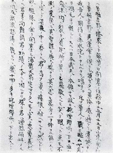 次いで、明治37年(1904)、日露戦争がはじまり、相生市では25人の人が戦死したといわれている。 上の写真は、戦死者の村葬に在郷軍人会長が霊前で読んだ弔辞の一部である。