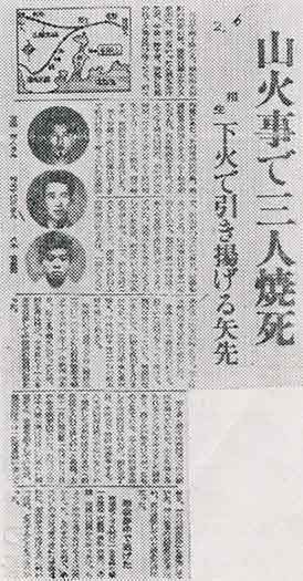 | 16 昭和42年(1967)1月12日には、陸東栄町で5戸が全焼している。 あらましは以上のとおりであるが、この項で特筆すべきは昭和41年(1966)におきた「青柳山の山火事」である。 この火災の焼失面積は60ヘクタールで消火に従事中の3人が殉職された。 この火災の報道は「犠牲者出した山火事」として話題を起こし、3人の犠牲者の合同市葬が2月7日午後2時から光明寺でしめやかに行なわれた。 |